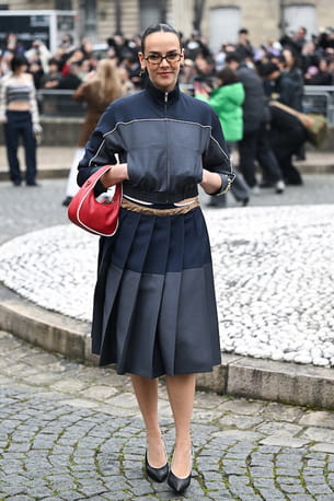 En amont du défilé Miu Miu automne-hiver 2025-2026, Pauline Ducruet a joué le jeu du photocall et pris la pose dans une silhouette affirmée qui a capté l'attention. Elle avait choisi d'enfiler un ensemble coordonné, composé d'une veste bomber fermée et d'une jupe mi-longue plissée, tous deux teintés de bleu marine et gris. Du côté des accessoires, des lunettes de vue rectangulaires en écaille de tortue, un sac à main rouge et des escarpins noirs au liseré blanc ont également permis à la fille de Stéphanie de Monaco de faire sensation.