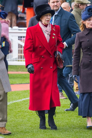 Ce jeudi 13 mars, la princesse Anne a honoré le Festival de Cheltenham de sa présence. Et pour assister à cet événement hippique qui est l'un des plus prestigieux du Royaume-Uni, elle avait revêtu une tenue électrisante. La fille d'Elizabeth II a fait son apparition dans un long manteau rouge vif, arborant deux rangées de boutons et des broches sur le col, qu'elle a accompagné d'une écharpe colorée, d'une paire de gants en cuir, de bottes à franges et d'un sac à main de couleur rouge également. Pour se couvrir la tête, elle avait misé sur un haut chapeau noir recouvert de fourrure.