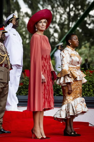 La visite d'État de trois jours du roi Willem-Alexander et de Maxima des Pays-Bas au Kenya a débuté ce mardi 18 mars par une rencontre avec le président William Ruto. L'occasion pour la reine d'enfiler une majestueuse tenue en portant une robe mi-longue dotée d'une élégante cape plissée et de détails en plumes sur le devant. Mais ce sont surtout ses accessoires qui ont mis le feu aux poudres puisqu'elle affichait un large chapeau bordeaux, une pochette de la même couleur ainsi que des escarpins semi-transparents assortis.