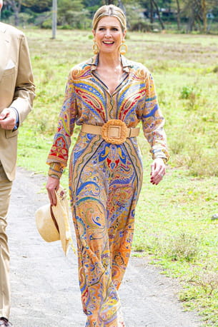 Maxima des Pays-Bas a une nouvelle fois conquis tout le monde en s'affichant dans une tenue estivale le deuxième jour de sa visite d'État au Kenya. Au sein d'un sanctuaire pour animaux, au lac Naivasha, elle est apparue avec une longue robe imprimé cachemire, d'une élégance indéniable. La pièce, ultra longue et colorée, était resserrée à la taille par une ceinture à la boucle en raphia. Du côté des accessoires, la souveraine a voulu rester dans le thème en adoptant des boucles d'oreilles XXL en osier, un chapeau en paille mais aussi des espadrilles.