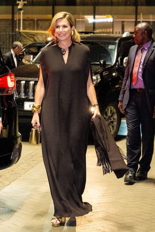 Ce mercredi 19 mars, le couple royal néerlandais a organisé une soirée en l'honneur du président William Ruto à l'hôtel Marriott de Nairobi. Un événement au cours duquel Maxima des Pays-Bas est apparue sublime dans une longue tunique chocolat, comprenant un mini masque tribal en guise de collier. Et c'est auprès de Valentino que la reine a déniché cette pièce parfaite pour l'occasion. Avec, elle avait misé sur des accessoires dorés, dont un mini sac à main, des sandales à plateformes, un bracelet manchette et de larges boucles d'oreilles, apportant immédiatement de la lumière à toute la tenue.