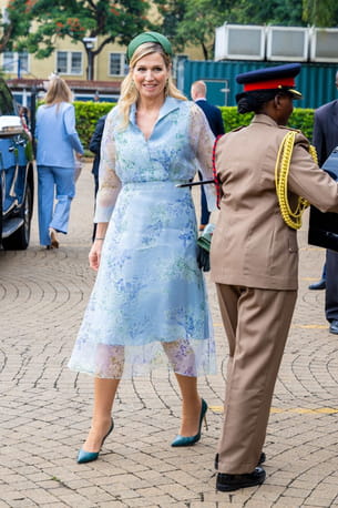 Afin de conclure leur visite d'État de trois jours au Kenya, le roi Willem-Alexander et la reine Maxima des Pays-Bas ont été reçus à la Cour suprême de Nairobi, ce jeudi 20 mars. Pour l'occasion, Máxima Zorreguieta avait jeté son dévolu sur une création de sa griffe favorite : la Maison Natan. Il s'agit d'une robe fleurie mi-longue recouverte d'un tissu transparent. Pour peaufiner ce look, la souveraine portait des escarpins accordés de Gianvito Rossi, une pochette croco mais aussi un couvre-chef vert ajoutant une touche encore plus printanière à l'ensemble.