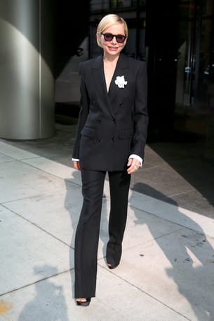 Michelle Williams, a été aperçue le 31 mars dernier, devant les studios de l'émission Watch What Happens Live with Andy Cohen à New York. Connue pour son élégance et son goût certain en matière de mode, l'actrice a brillé dans une tenue sophistiquée, mêlant sobriété et glamour. Elle a posé devant les photographes présents sur place, vêtue d'un tailleur noir à fines rayures composé d'un pantalon à pinces et d'un blazer mi-long à double boutonnage. Ce dernier était d'ailleurs orné d'une broche à fleur blanche.