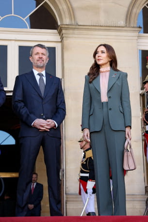Pendant leur séjour en France, le roi et la reine du Danemark ont visité la Manufacture des Gobelins, une manufacture historique de tapisseries. Et comme à son habitude, la reine était sur son 31. Ici, elle avait choisi d'enfiler un ensemble gris foncé à la pointe de la tendance. Il se composait d'une veste de blazer et d'un pantalon droit en crêpe de la marque Scanlan Theodore. Sa veste entrouverte laissait apparaitre une jolie blouse rose poudré parfaitement assortie à son sac à main. Une réussite !