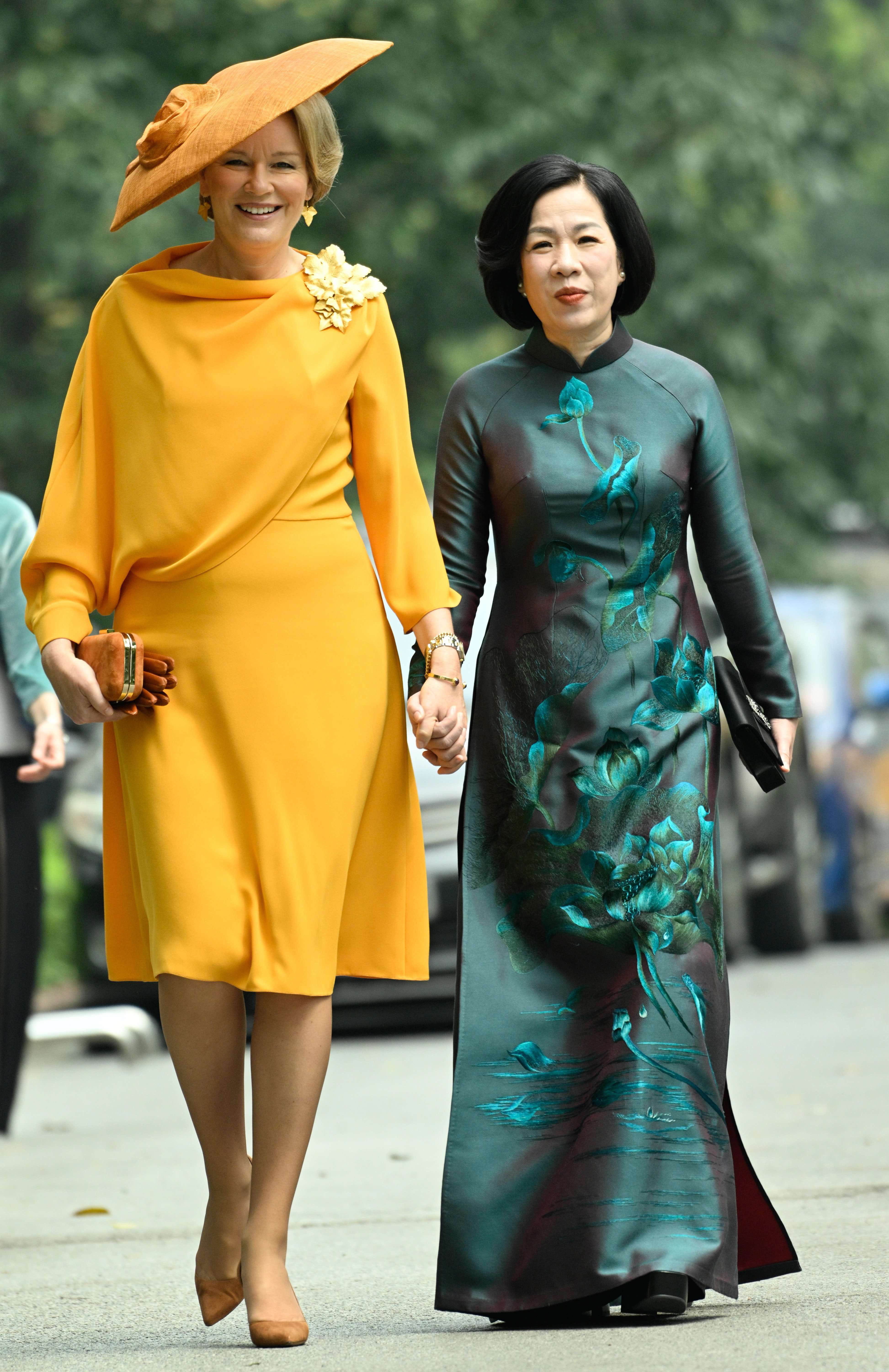 À chacun de ses déplacements, les looks de Mathilde de Belgique sont littéralement scrutés. Pour son voyage à Hanoï, la reine des Belges a misé sur une tenue des plus voyantes. En effet, ce mardi 1er avril, elle s'est recueilli au monument des Héros nationaux et au Mausolée Hô Chi Minh, en hommage aux victimes de la guerre du Vietnam. L'occasion de revêtir un total look jaune qui se composait d'une robe drapée de la marque Natan, d'un chapeau imposant et d'une paire d'escarpins. Encore une belle preuve d'élégance de sa part !