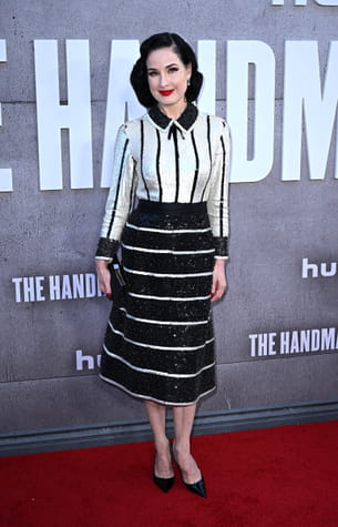 A Los Angeles, Dita Von Teese est arrivée à la première de la saison 6 de la série à succès The Handmaid's Tale. Sur le tapis rouge, elle a opté pour une tenue qui contrastait. En effet, la jolie brune a osé une association de rayures audacieuses, qui était pourtant parfaitement réussie. Elle portait une jupe noire aux rayures horizontales blanches lui arrivant jusqu'aux genoux et un chemisier blanc aux rayures verticales noires. Un jeu de contraste qui sublimait sa silhouette et marquait sa taille de guêpe.