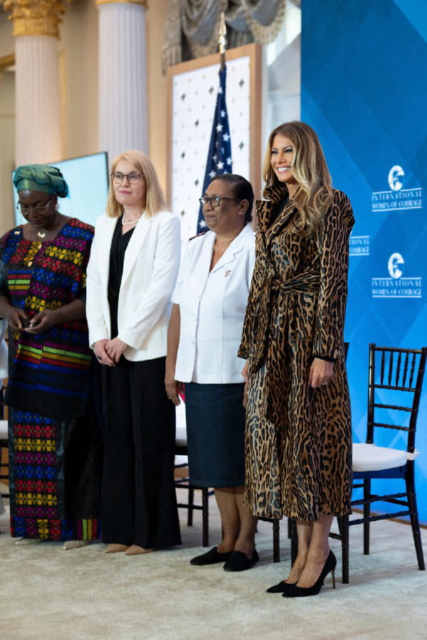 Ce mardi 1er avril, Melania Trump a participé à la cérémonie des International Women Of Courage Awards. Pour l'événement à Washington, l'épouse de Donald Trump portait une veste ceinturée à imprimé léopard de la créatrice américaine Milly Park. Cette pièce issue de la collection automnale est vendue au prix de 12 000 dollars, mais a évidemment été envoyée gratuitement à la Première dame. Sous ce manteau en cuir de veau imprimé léopard, Melania Trump portait une tenue monochrome. Autant dire qu'elle a attiré tous les regards, une fois de plus.