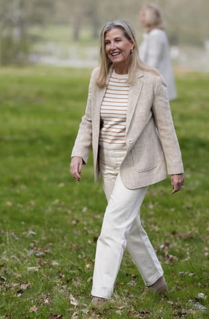 Sophie d'Édimbourg a profité de sa visite au Yellow Labrador Club, ce mardi 8 avril, pour faire de nouvelles prouesses stylistiques. En effet, elle a été photographiée dans une tenue fraîche au zénith de l'élégance qui se composait d'un blazer texturé dont la nuance beige se mariait à merveille avec le pull orné de rayures et le pantalon blanc aux coutures contrastantes. Du côté des chaussures, la duchesse s'était emparée d'une paire de bottes marron clair à lacets afin de jouer les tons sur tons. Et résultat : l'harmonie est parfaite !