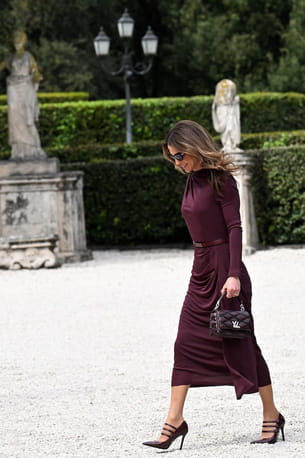 De passage dans la capitale italienne pour s'entretenir avec Giorgia Meloni, ce mercredi 9 avril, Rania de Jordanie a saisi cette occasion pour se montrer dans une tenue monochrome à couper le souffle. Elle était ainsi vêtue d'une robe près du corps de couleur bordeaux. Signée Erdem, la création comportait un élégant drapé et une ceinture assortie marquant la taille. Côté accessoires, la reine a misé sur du bordeaux, là aussi, en portant des escarpins vernis à brides de Bottega Veneta, un petit sac matelassé Louis Vuitton et des lunettes de soleil.