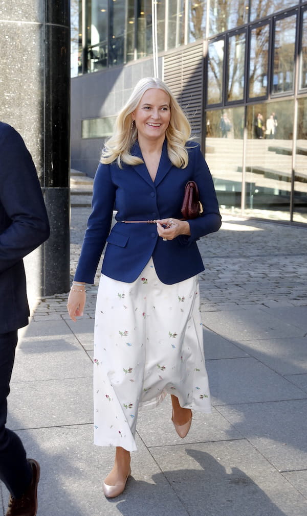 Malgré les protocoles vestimentaires royaux, Mette-Marit de Norvège est une source d'inspiration sans faille. Pour preuve : elle a transformé un simple blazer bleu marine en une pièce statement avec une ceinture fine et minimaliste qui marque sa taille lors d'un séminaire de littérature à Oslo. Pour accompagner cette jolie pièce, la future reine a choisi d'arborer une longue jupe blanche brodée de petites fleurs. L'ensemble, à la fois chic et printanier, était accessoirisé par une pochette bordeaux sous le bras, des ballerines nude et des bijoux argentés.