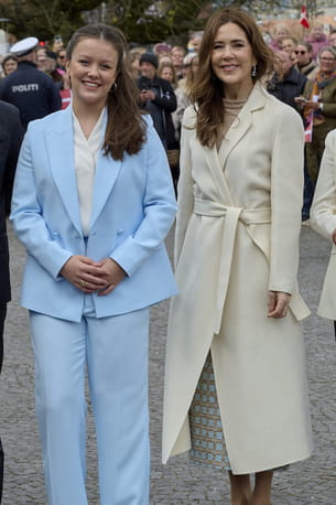 Ce vendredi 11 avril, les festivités en l'honneur du 18e anniversaire de la fille du roi Frederik X et de la reine Mary ont eu lieu à Aarhus, deuxième ville du pays. Pour l'occasion, Mary du Danemark était sublimée d'un manteau blanc ceinturé qui recouvrait une robe nude et bleue s'achevant au niveau des chevilles et d'une paire d'escarpins vernis, de couleur nude également. Quant à la principale intéressée, elle avait revêtu un tailleur pantalon bleu ciel porté avec une blouse blanche et des chaussures en daim marron. Magnifiques !