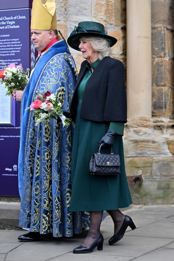 Camilla Parker-Bowles a assisté, ce jeudi 17 avril, à une messe de Pâques en compagnie de son époux le roi Charles III. Immortalisée sur le parvis de la cathédrale de Durham, un bouquet de fleurs en main, la monarque de 77 ans affichait une robe mi-longue vert forêt imaginée par la marque londonienne Anna Valentine. Elle était également munie d'un chapeau assorti, de gants en cuir, d'un sac Chanel matelassé, de collants semi-transparents, de talons classiques ainsi que d'un boléro aux manches 3/4 pour ne pas avoir froid.