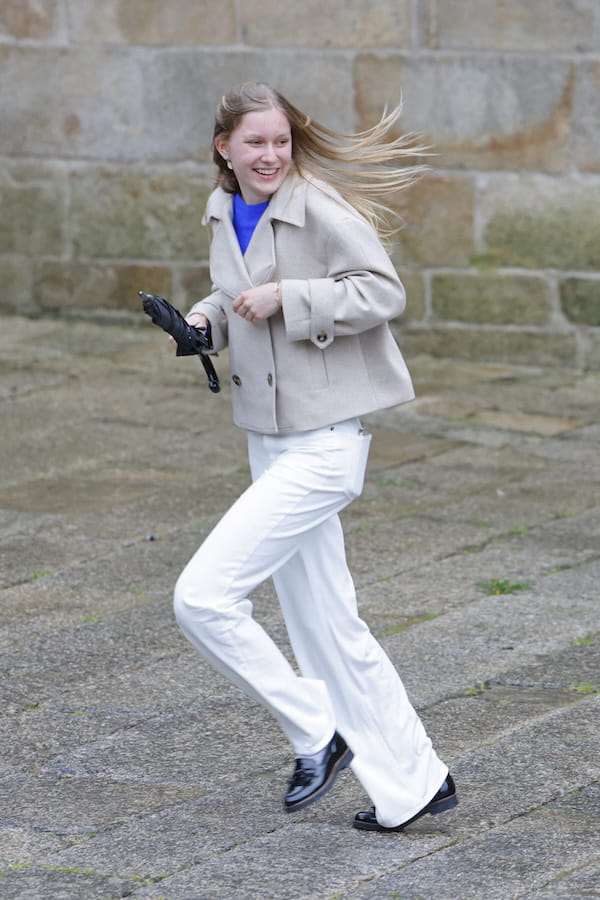 Après avoir terminé le pèlerinage de Saint-Jacques-de-Compostelle, la famille royale de Belgique s'est rendue à la messe du Jeudi Saint. Le moment idéal pour arborer une tenue à la fois casual et élégante, comme l'a fait la princesse Éléonore. Elle avait opté ce jour-là pour un pull bleu électrique associé à un jean droit en denim blanc, le tout surmonté d'un caban beige. Et c'est cette pièce, s'arrêtant au niveau du bassin, qui lui conférait une allure de mannequin. À ses pieds, la jeune femme portait tout simplement des mocassins en cuir verni.