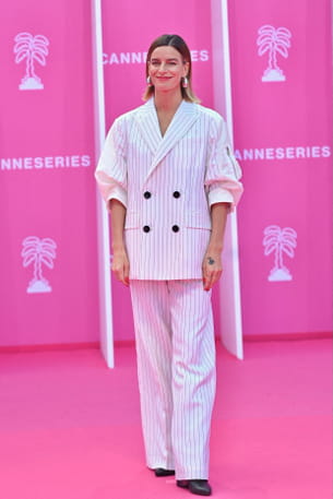 Dimanche 27 avril, Fauve Hautot était somptueuses sur le tapis rose du festival Canneséries. Devant les photographes, elle a posé vêtue d'un costume ample à la fois chic et confortable. De teinte blanche à fines rayures noires, cette tenue était lumineuse pour la saison. La veste originale se distinguait par des manches bouffantes et retroussées ainsi que des boutons imposants. La danseuse a accessoirisé ce look avec des bottines noires à plateformes de la marque française Givenchy. C'est un grand oui !