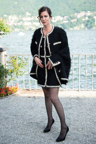 Anna Mouglalis incarne l'élégance à la française dans ce tailleur noir texturé aux finitions dorées et doté de sublimes perles. Cette pièce mode évoque l'héritage de Chanel grâce notamment à un contraste entre la matière duveteuse et les lignes structurées. Les collants fins noirs et les escarpins classiques apportent davantage de raffinement au look, tandis que sa coiffure floue et son maquillage sobre offrent une touche de modernité et de