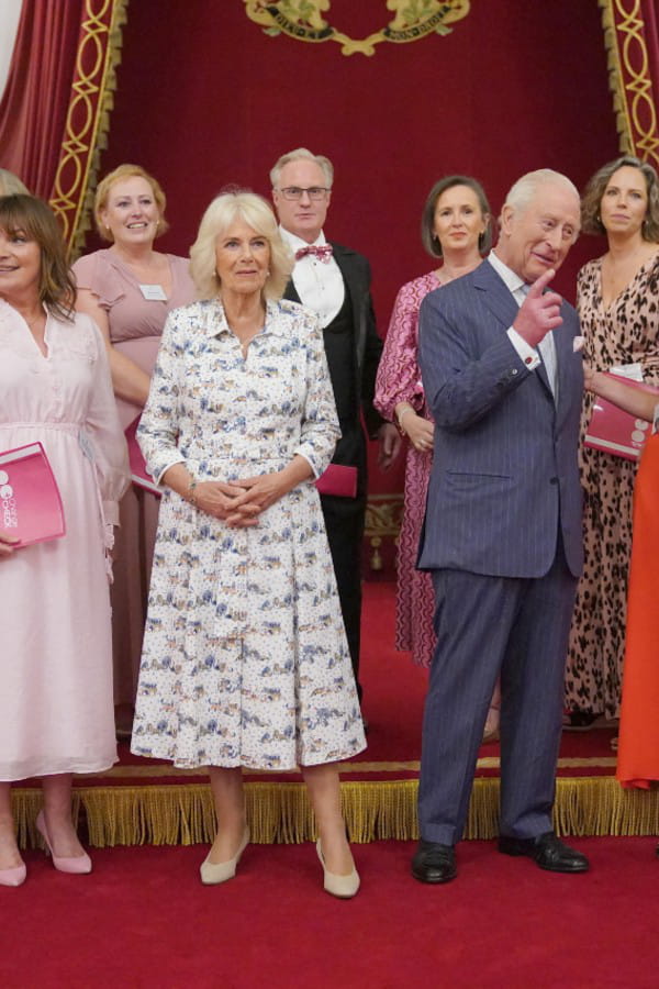Le 30 avril 2025, le roi Charles et la reine Camilla ont organisé un gala au palais de Buckingham pour célébrer les initiatives communautaires visant à sensibiliser au cancer et à soutenir les personnes atteintes de cette maladie. Lors de la représentation, Camilla Parker Bowles a fait sensation avec une robe printanière. Pleine d'assurance, elle est arrivée avec une robe à la coupe midi boutonnée sur le devant qui laissait apparaitre de petits imprimés et des motifs floraux. La reine a signé ici son look signature !