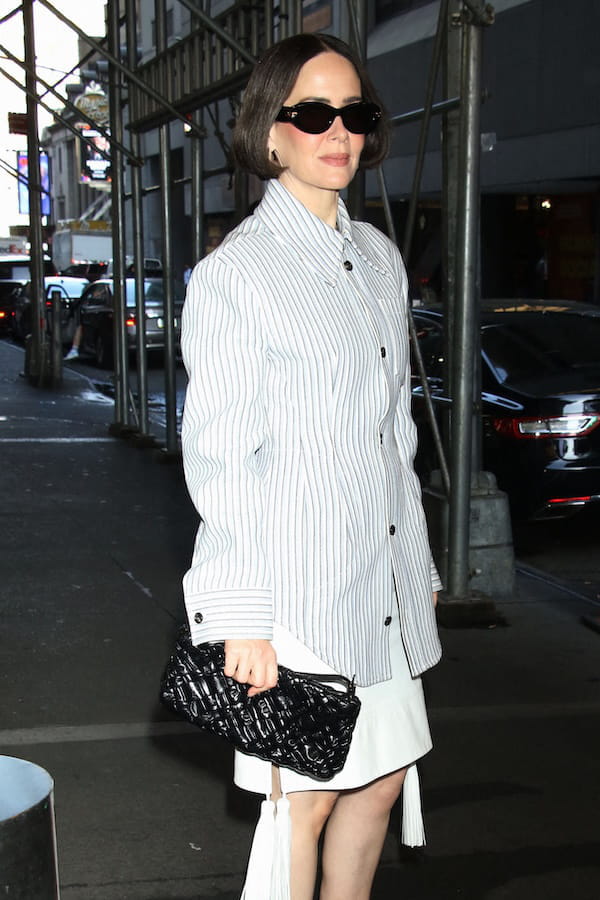 Sarah Paulson était remarquablement stylée lors de son passage dans CBS Mornings pour annoncer sa nomination aux Tony Awards 2025. En témoigne le cliché pris devant les studios, sur lequel elle apparaît vêtue d'une chemise rayée oversize qu'elle a superposé à une jupe blanche à pompons. La star du cinéma avait choisi des accessoires noirs, dont une paire de mules à talons, une pochette rectangulaire au fini tressé et des lunettes de soleil ovales, pour aller avec cette tenue. Élégance et raffinement étaient au rendez-vous.