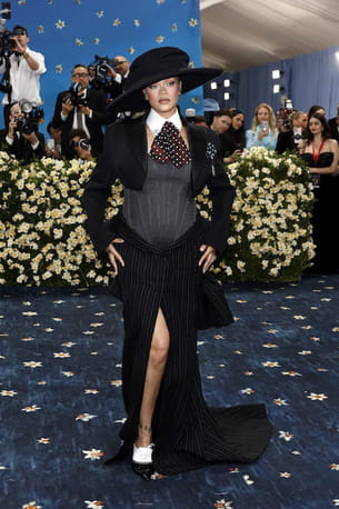 Parmi les nombreuses célébrités présentes sur les marches du Metropolitan Museum of Art de New York ce lundi 5 mai, Rihanna a attiré tous les regards dans une tenue Marc Jacobs respectant le thème "Superfine : Tailoring Black Style". Enceinte de son troisième enfant, la chanteuse avait mis en avant son ventre rond avec un corset gris associé à une veste ultra courte et à une jupe à rayures dotée d'une fente et d'une traîne. Pour donner un peu plus de dimension à l'ensemble, elle a misé sur un large chapeau noir, des bijoux Messika et des Richelieu bicolores.