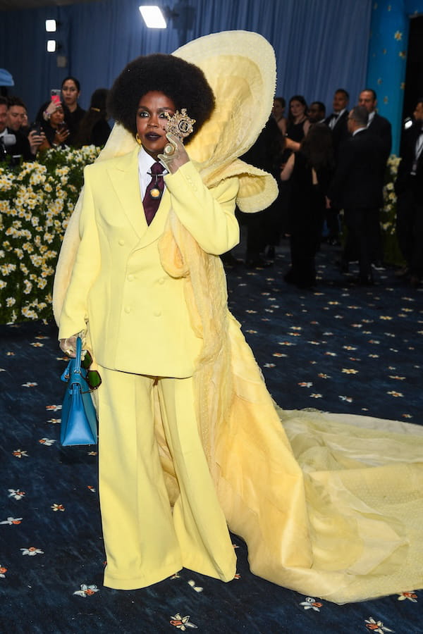 Ce lundi 5 mai, Lauryn Hill a choisi de porter une création ultra solaire pour son passage sur le tapis rouge du Met Gala 2025. Cette dernière prenait la forme d'un costume jaune extra-large avec une immense cape dotée d'une traîne s'ouvrant dans le dos. En dessous, on pouvait distinguer une chemise blanche qui s'accompagnait d'une cravate bordeaux alors qu'un sac bleu vif, des lunettes de soleil et des bijoux XXL faisaient office d'accessoires. Le tout était complété par des gants en tulle transparent pour une allure des plus maîtrisées.