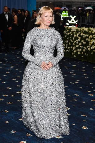 Pour le Met Gala auquel elle était invitée pour la deuxième fois, Pamela Anderson a présenté une silhouette étincelante signée Tory Burch. La robe, entièrement brodée de sequins argentés au fini brillant, se distinguait par des manches longues, une large encolure et du volume sur les hanches. Un look grand soir complété d'un carré à frange, mais surtout d'un spectaculaire bijou d'oreille Pandora qui se suffisait à lui-même, composé de diamants de synthèse 24 carats. De la tenue, aux accessoires en passant par la coiffure, chaque détail était pensé pour sublimer la star du cinéma !
