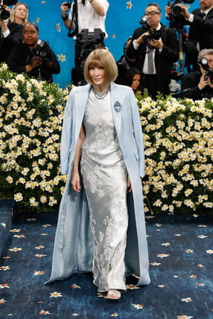 La directrice de l'édition américaine de Vogue, Anna Wintour, était l'une des premières à s'élancer sur le tapis rouge du Met Gala et elle n'a pas fait les choses à moitié. Son look se composait d'une veste bleu pastel touchant le sol, surmontée d'une broche en pierre précieuse au niveau du col, qu'elle portait nonchalamment sur les épaules. En dessous, une longue robe en satin recouverte de broderies mettait sa silhouette en valeur. Anna Wintour accessoirisait le tout avec des sandales blanches et un collier scintillant à trois rangs pour briller de mille feux.