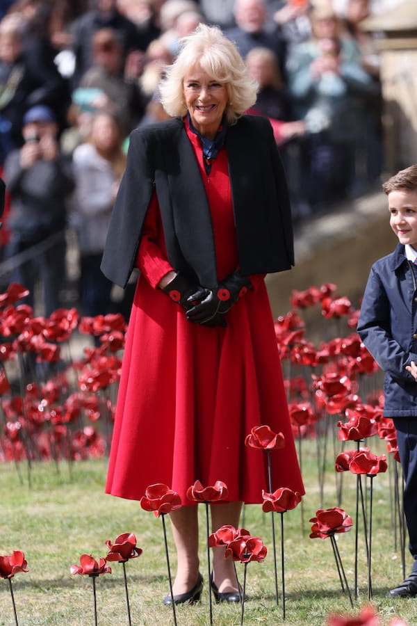 À l'occasion du 80e anniversaire de la fin de la guerre, 30 000 coquelicots en céramique ont été plantés à la Tour de Londres, symbole des anciens combattants, dont quelques-uns par la reine Camilla. Pour l'occasion, elle était vêtue d'une tenue qui n'a pas été choisie au hasard. En effet, c'est dans une robe mi-longue de couleur rouge vif qu'elle s'est présentée devant la foule. Ce vêtement était accompagné d'une courte cape noire, de gants en cuir sur lesquels étaient brodées des coquelicots, d'un foulard bleu marine et de talons bas. Un coquelicot parmi les coquelicots !