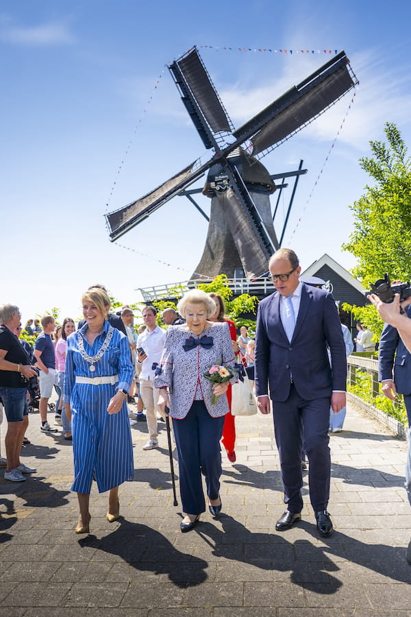 La princesse Beatrix des Pays-Bas s'est rendue à Witmarsum ce samedi 10 mai afin de visiter le moulin De Onderneming, à l'occasion de la Journée nationale du moulin. Pour cet événement, l'ancienne souveraine arborait le parfait look printanier : une blouse liberty rehaussée d'un gros nœud au milieu et de manches bouffantes, un pantalon large de couleur bleu marine et des souliers plats type ballerines à l'élégance extrême. Elle avait également misé sur quelques bijoux dorés, dont un bracelet et un collier, et sur un bouquet de fleurs pour rehausser sa tenue.