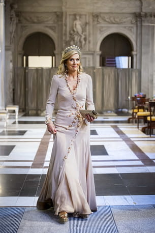 Maxima des Pays-Bas a attiré tous les regards lors du traditionnel dîner du Corps diplomatique, sur le thème de l'art et de la culture, en apparaissant avec une pièce qu'elle avait déjà portée il y a plus de 15 ans. Il s'agissait d'une longue robe beige Jan Taminiau qui se distingue par de la broderie de sequins sur les extrémités. Une tenue accessoirisée de sandales dorées à plateformes Schutz Keefa et d'une pochette Dior. Enfin, le diadème de perles pavlonie et les boucles d'oreilles assorties complétaient son allure royale.