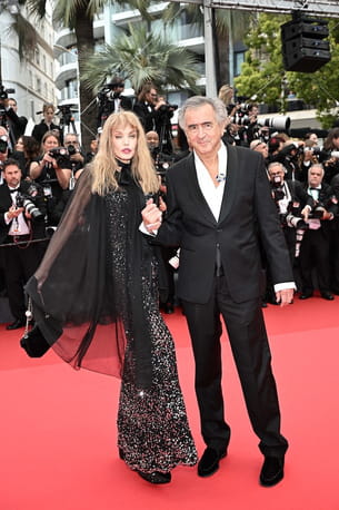 Arielle Dombasle a fait un passage sur le tapis rouge du festival de Cannes, ce mardi 13 mai, avant de s'installer dans les fauteuils du palais des festivals pour la projection de Partir un Jour. Photographiée main dans la main avec Bernard-Henri Lévy, elle est apparue plus glamour que jamais dans une maxi robe à strass. Celle-ci se caractérisait par des longues manches transparentes et une cape en mousseline attachée autour de son cou. Et pour encore plus de style, la star avait opté pour un sac à main noir ainsi que pour des souliers aussi brillants que la tenue.