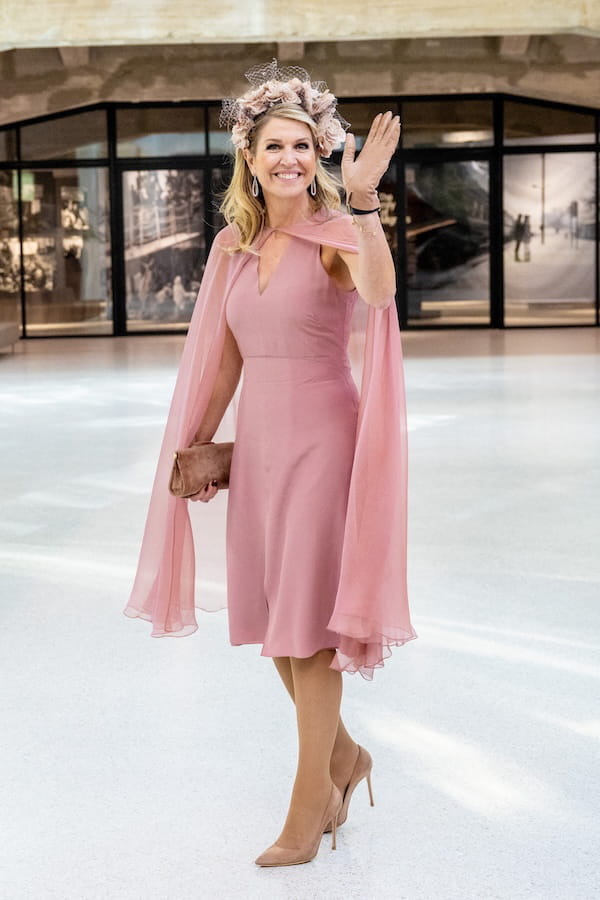 À l'occasion de l'inauguration du musée Fenix de Rotterdam qui avait lieu ce jeudi 15 mai, Maxima des Pays-Bas a fait une apparition féerique, lovée dans une somptueuse robe. La souveraine portait pour l'occasion une robe Natan Couture de couleur vieux rose qui se distinguait par une cape semi-transparente ton sur ton. En guise d'accessoires, elle avait misé sur des gants en cuir, une pochette beige et des escarpins en daim Gianvito Rossi. Le clou du spectacle ? Sa magnifique couronne de fleurs signée Betty Rutjes.