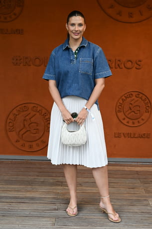 Camille Cerf a choisi d'adopter un look casual chic parfait pour assister à un match de Roland-Garros. Elle a associé une chemise ample en jean, au style décontracté et légèrement oversize, à une jupe plissée blanche qui ajoutait du mouvement à sa silhouette. Bien que classique, cette tenue était particulièrement élégante. Ses sandales à talons fins et sa pochette blanche matelassée apportaient une touche sophistiquée à ce look estival. Cheveux tirés en queue de cheval et make-up naturel : l'ex-Miss était jolie comme un cœur.
