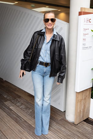 Invitée à Roland-Garros, Laeticia Hallyday a adopté un look casual chic très réussi. Elle portait un ensemble en jean bleu délavé composé d'un jean large et d'une chemise en jean décontractée. Le tout était cintré à la taille par une ceinture noire à boucle dorée. Par-dessus, elle y ajouté une veste en cuir noir oversize, qui apportait une touche rock dont elle seule a le secret. Côté accessoires, elle a opté pour un sac à chaîne dorée, des créoles et des lunettes aviateur qui complétaient ce style à la fois tendance et intemporel.
