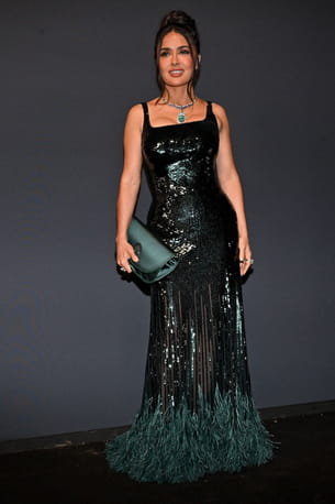 La belle Salma Hayek était l'une des nombreuses personnalités invitées au dîner annuel Women In Motion Awards organisé en marge du festival de Cannes, ce dimanche 18 mai. Pour l'occasion, elle était particulièrement captivante dans une longue robe verte dotée d'un ourlet à plumes et recouverte de sequins qui lui donnaient des allures de sirène. Une pièce glamour qu'elle avait accessoirisé d'une pochette en tissu satiné dans les mêmes teintes mais aussi d'un collier auréolé d'une très grosse pierre en accord avec la tenue.