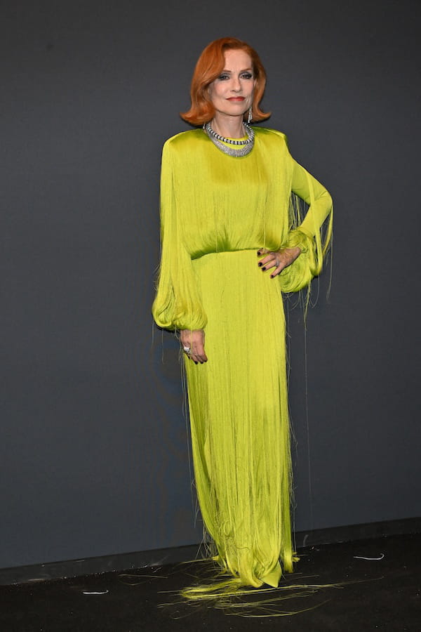 Isabelle Huppert confirme son statut de grande fashionista avec une robe fluo à franges