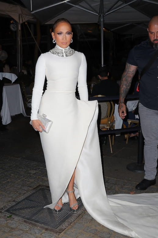 Jennifer Lopez a très vite capté tous les regards à l'occasion de la soirée Ring Them Bells! A Celebration for John Kander ce lundi 19 mai. Et pour cause, vêtue d'une robe blanche sculpturale présentant des manches longues, un col haut, un corsage ajusté, une fente au design volumineux et une longue traîne, la star internationale était magnifique. Une création lumineuse qui allait à merveille avec ses accessoires argentés, à savoir ses sandales à plateformes, sa minaudière, son collier plastron et ses créoles incrustées de pierres précieuses.