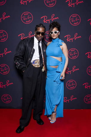 Après la projection du film Highest 2 Lowest, Rihanna et A$AP Rocky se sont rendus à la soirée Ray-Ban organisée sur un yacht. Enceinte de son troisième enfant, la chanteuse a mis en valeur son ventre arrondi avec une robe bleu turquoise à découpes de la maison Alaïa alors que le rappeur portait une chemise cravate avec un blouson bomber, un pantalon de costume et une ceinture de catch. Des tenues sophistiquées que les deux tourtereaux ont pris soin d'associer à une paire de Ray-Ban, blanche pour elle et noire pour lui.