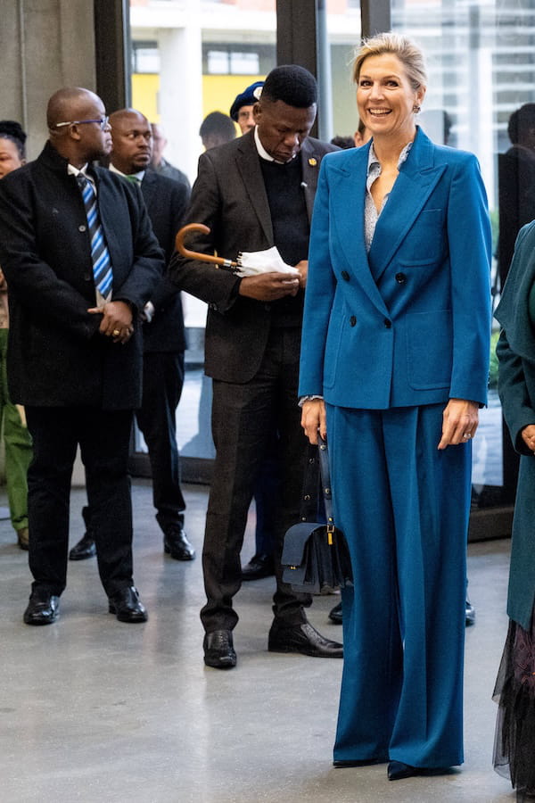 Pour son premier voyage dans le cadre de son mandat de défenseure spéciale du Secrétaire général des Nations unies pour la santé financière, Maxima des Pays-Bas a pris la direction de l'Afrique du Sud le 20 mai dernier. Fidèle à son style, elle s'était glissée dans un ensemble de costume bleu rétro signé Dries Van Noten. La souveraine néerlandaise optait également pour une chemise blanche à l'imprimé en dessous, offrant du contraste à la tenue, mais aussi pour un sac à main accordé Marni et pour des escarpins ton sur ton de Gianvito Rossi.