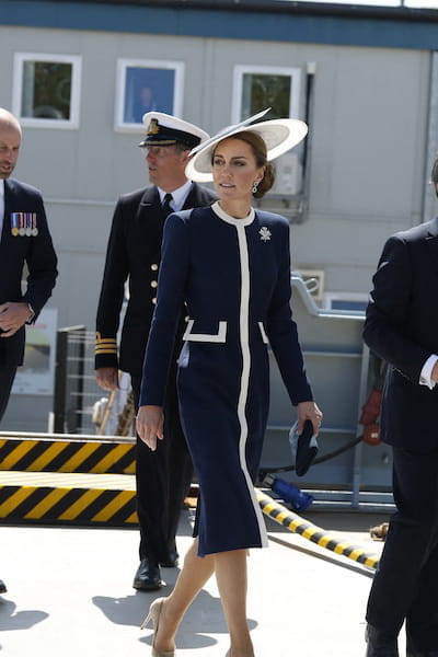 De passage en Écosse pour l'inauguration d'un nouveau navire de la marine britannique, Kate Middleton a arboré une tenue de circonstance rappelant l'uniforme marin. La princesse, dont le sens du style n'est plus à prouver, a en effet choisi d'arborer une robe bleu marine aux liserés blancs de chez Suzannah London et un chapeau Philip Treacy accordé. Une tenue immensément chic matchant à la perfection avec ses boucles d'oreilles en saphir et diamants et avec sa broche conçue par le joaillier écossais James Porter & Son.