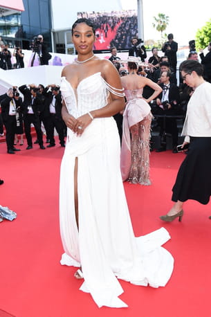 Angelique Angarni-Filopon était resplendissante dans une robe blanche pour monter les marches du Palais des Festivals ce jeudi 22 mai. La pièce choisie par Miss France 2025 a été dessinée par ses soins et réalisée par l'atelier Sima Couture. Totalement immaculée, elle présentait une ribambelle de perles au niveau du buste, un effet drapé sur la taille et une jupe asymétrique à la large ouverture qui sublimait son jeu de jambes. Côté accessoires, elle a mis le paquet en osant un collier Mauboussin et des sandales à talons blancs.