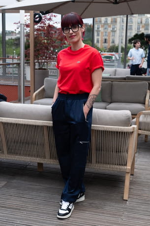 Jennifer Ayache était présente au tournoi de Roland-Garros le 29 mai dernier et elle s'est affichée, ce jour-là, dans un look des plus décontractés. Elle rayonnait alors dans un tee-shirt rouge impeccablement coupé aux manches légèrement retroussées. Côté pantalon, la chanteuse de Superbus avait misé sur un bas en satin de couleur bleu nuit. Son plus ? Les fermetures éclairs qui habillent ses côtés. Et pour accessoiriser cette silhouette entièrement signée Lacoste, elle avait ajouté des baskets bicolores.