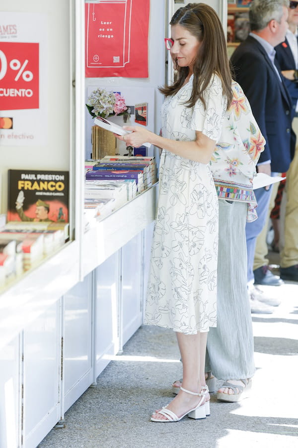 Letizia d'Espagne a visité la 84e édition de la Foire du livre de Madrid au parc du Retiro, ce vendredi 30 mai. L'occasion pour la souveraine d'afficher une allure printanière pile dans la tendance. C'est en effet dans une robe-chemise Hugo Boss recouverte d'un imprimé floral noir et blanc et arrivant en dessous des genoux qu'elle est apparue à l'évènement littéraire. Pour accessoiriser sa tenue de saison, la mère des princesses Leonor et Sofia avait misé sur une paire de sandales blanches au petit talon bloc. Chic comme toujours !