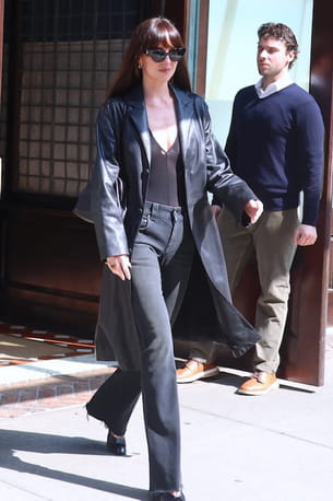 C'est dans une silhouette très mode que Dakota Johnson a choisi de se dévoiler ce lundi 2 juin en quittant son hôtel du quartier Tribeca à New York. Le point fort de son look ? Un trench coat en similicuir noir à la coupe mi-longue ultra fluide qu'elle adoptait avec d'autres vêtements sombres dont un top transparent au décolleté plongeant et un jean droit au fini légèrement délavé. La star du cinéma avait aussi aux pieds des chaussures à talons et des lunettes cat-eye vissées sur le nez. La classe, on vous dit !