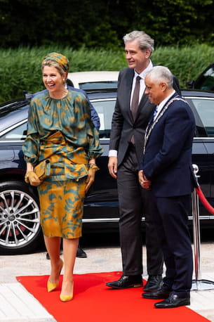 Maxima des Pays-Bas était de sortie ce mardi 3 juin pour l'inauguration du nouveau centre des cliniques Bergman. À cette occasion, l'épouse de Willem-Alexander choisit de se distinguer dans une silhouette Natan, déjà portée en 2021, qui se composait d'une blouse en soie imprimée et d'une jupe fourreau dotée d'un gros nœud à la taille. Un turban réalisé avec le même tissu que l'ensemble trônait également sur la tête de la reine. Pour le reste, elle avait décidé d'arborer une pochette assortie, des gants en résille ainsi que des escarpins jaunes de Gianvito Rossi.