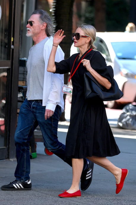 Repérée dans les rues de Manhattan avec son mari Billy Crudup, ce mardi 3 juin, Naomi Watts a fait sensation avec un look bicolore effortlessy chic. Elle était vêtue d'une robe chemise noire arrivant au niveau des genoux avec une paire de ballerines rouges à nœud pour ajouter une dose de gaieté. Le tout était accessoirisé d'un sac cabas en cuir porté sur l'épaule et d'une paire de lunettes de soleil Gucci à la monture oversize. À la clé ? Un look de saison qui allait à merveille à l'actrice et productrice de 56 ans. Une réussite !
