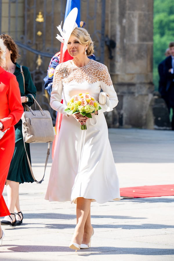 Pour sa première journée de visite à Prague à l'occasion de sa visite d'Etat, Maxima des Pays-Bas a sorti une robe au comble du chic et du raffinement. Il s'agit d'un modèle immaculé de Jan Taminiau qui se distingue par sa coupe évasée. Mais c'est sur le haut que tout se joue puisqu'il affiche un empiècement transparent brodé de fleurs au niveau du buste et des épaules, apportant une touche de féminité. Un large chapeau Philip Treacy, une pochette accordée et une paire d'escarpins transparents venaient terminer la tenue de la reine.