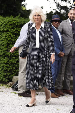 Lors de sa présence au Garden Museum de Londres pour la British Flowers Week ce mercredi 4 juin, Camilla Parker-Bowles a capté tous les regards dans une robe noire recouverte de pois blancs. La pièce en question était taillée dans un tissu fluide, avec un col contrastant, des manches légèrement bouffantes et une longueur arrivant sous les genoux. Elle y ajoute une paire d'escarpins beige au bout noir qui sublime parfaitement sa silhouette et une pochette en cuir tressé pour une allure de reine incroyable. On valide à 100 % !