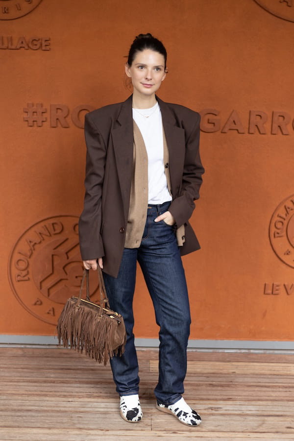 Aperçue sur le photocall du tournoi de Roland-Garros ce mercredi 4 juin, Joséphine Japy avait misé sur la simplicité d'un look neutre en adoptant un tee-shirt blanc surmonté d'un cardigan camel et d'une veste de costume marron à la coupe oversize. Avec, la comédienne française adoptait un pantalon en denim foncé assez près du corps et un long sac en daim agrémenté de nombreuses franges. Et quoi de mieux qu'une jolie paire de baskets Adidas à l'imprimé vache, grande tendance du moment, pour ponctuer l'allure.