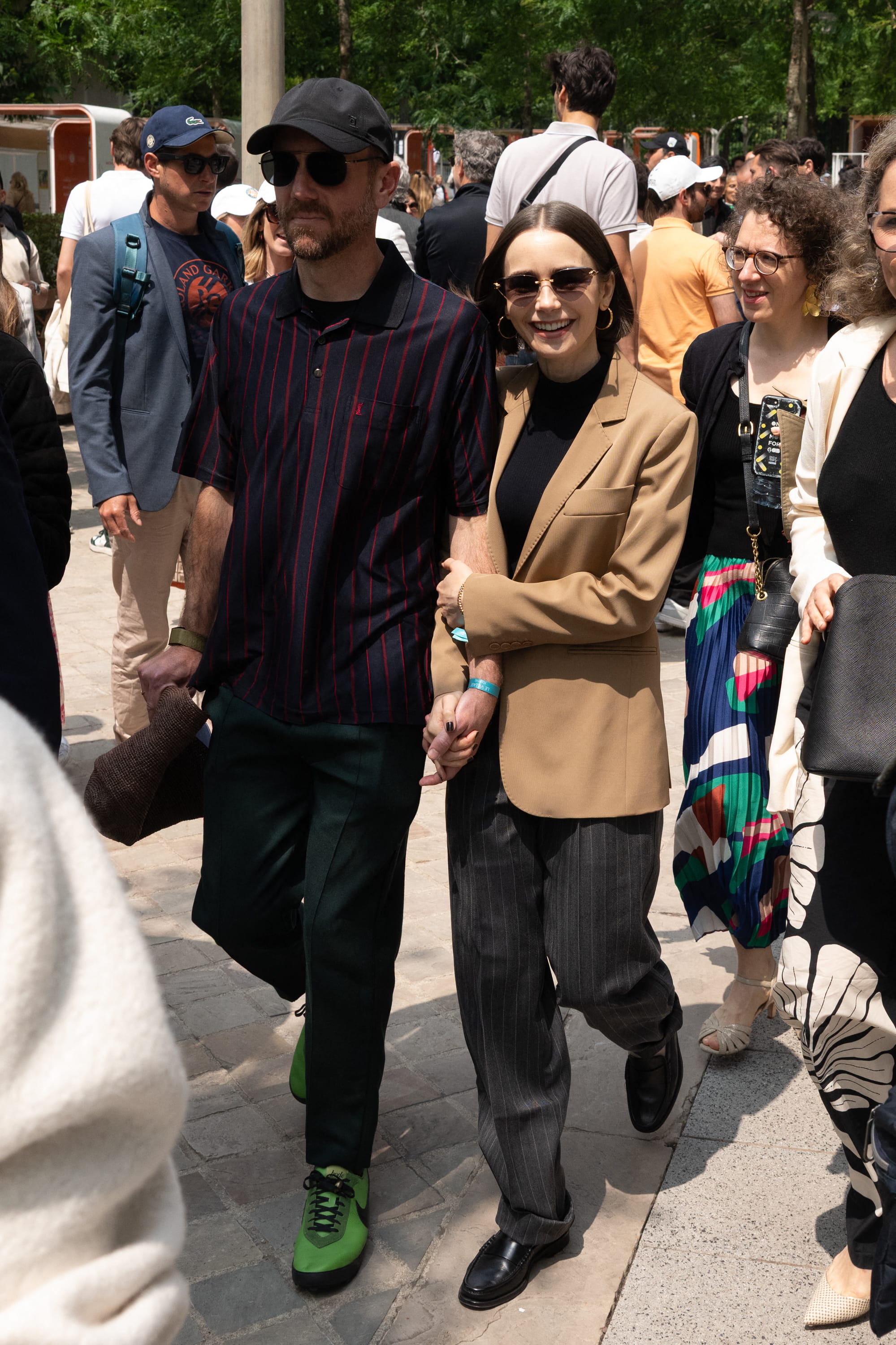 Le 8 juin dernier, Lily Collins s'est éclatée avec son mari dans les tribunes de Roland-Garros. Incognito, elle avait revêtu une tenue plutôt passe-partout. qui n'entachait en rien son charme naturel. En effet, la star portait un pantalon à fines rayures oversize qu'elle avait retroussé avec des ourlets et un blazer long camel sur un top noir à col montant. Des teintes plutôt automnales qui lui vont très bien au teint. Avec ce look, l'actrice ne semble pas avoir enclenché le mode été. Des teintes