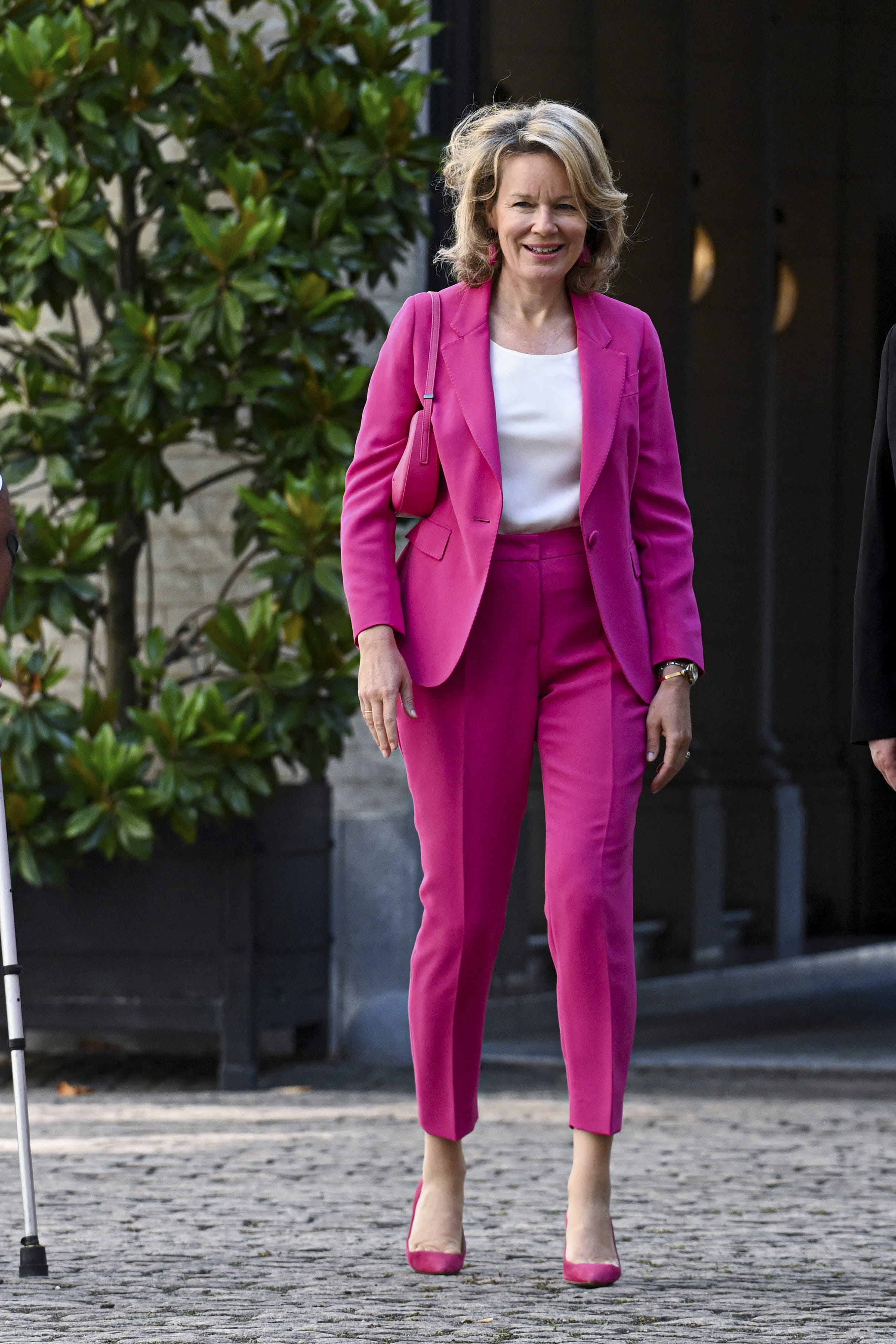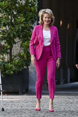Mathilde de Belgique a fait une apparition remarquée ce jeudi 12 juin. La reine a reçu au Palais royal de Bruxelles une délégation du Programme des Nations unies pour le développement et le moins que l'on puisse dire c'est qu'elle n'est pas passée inaperçue. En grande fan du rose bonbon, elle a revêtu un total look vif qui lui allait à merveille. Au programme : un pantalon 7/8 et une veste de blazer. Le tout assorti à son sac à main et ses escarpins. Un t-shirt blanc uni venait tout de même apporter une touche de douceur à l'ensemble.