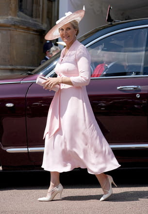 Pour participer à la cérémonie annuelle de l'Ordre de la Jarretière, la duchesse d'Édimbourg affichait un look girly et printanier. Elle portait une robe midi rose pâle, fluide, avec des manches longues ajustées et un décolleté en V. La robe était cintrée à la taille par une fine ceinture assortie, d'où partait un drapé subtil sur le devant. Une capeline, de couleur assortie à sa robe, complétait sa tenue, ajoutant une touche de sophistication. Elle avait choisi des escarpins nude à bouts pointus et une pochette assortie à sa robe.